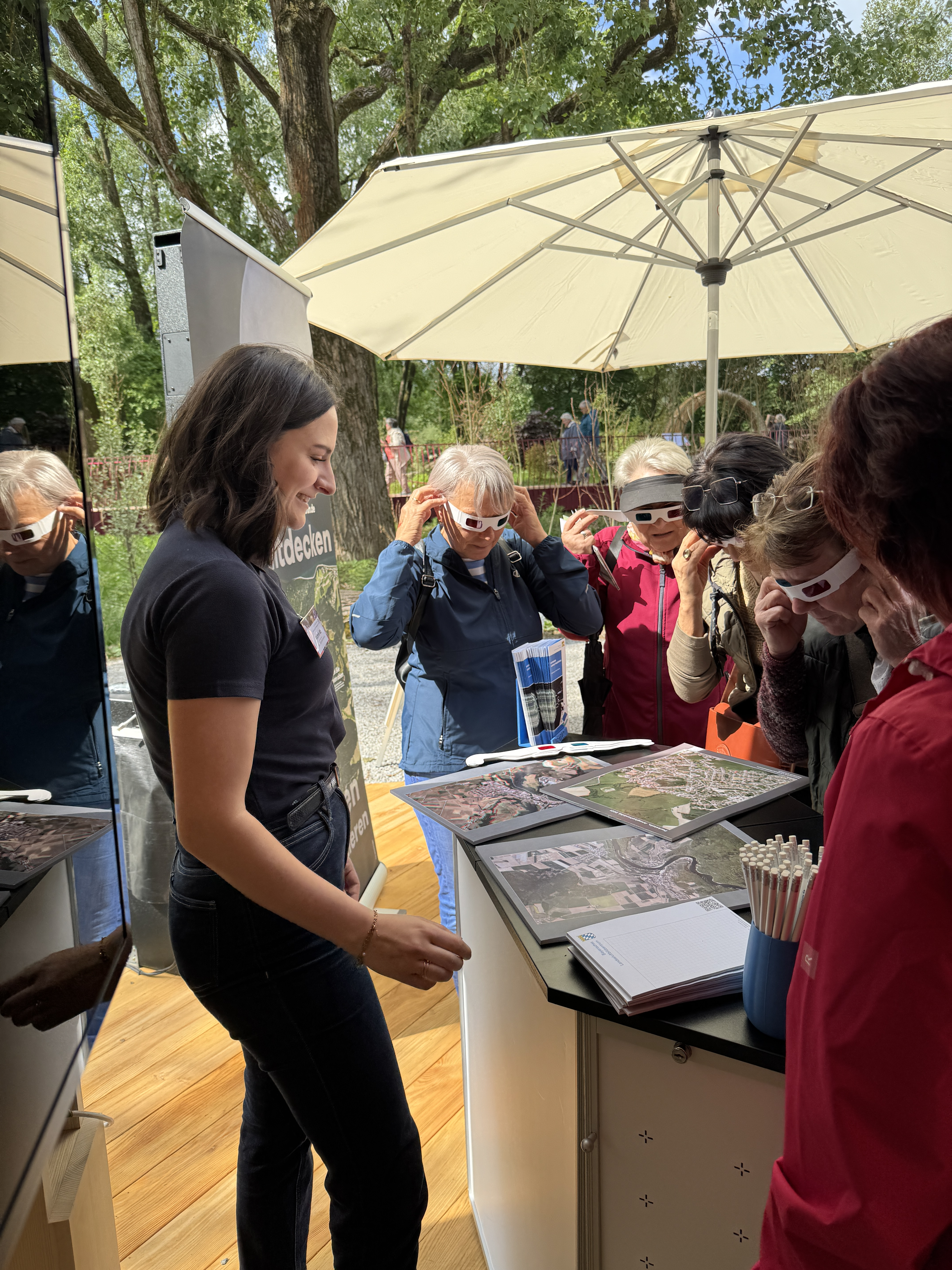 Den Auftakt machte das Bayerische Landesluftbildzentrum mit beeindruckenden Luftbildaufnahmen von Furth im Wald. Als besonderes Highlight wurde ein großer „Luftbildteppich“ ausgelegt, auf dem Besucher die Stadt aus der Vogelperspektive entdecken konnten – ein echter Publikumsmagnet, der Neugier und Staunen gleichermaßen weckte. Die Besucher lauschten gespannt dem Vortrag von Ann-Kathrin Johner, die anschaulich die Geschichte und Aufgaben des Bayerischen Landesluftbildzentrums erklärte, sowie dem Ranger des Landkreises Cham, Herrn Christoph Grausam, der eindrucksvoll zeigte, wie abgestorbene Bäume anhand von CIR-Luftbildern erkannt werden können. Besonders großes Interesse fand die Luftbild-Recherchestation begleitet von der Leitung des Landesluftbildzentrums Silvia Pertschi, an der die Gäste selbstständig Luftbilder aus verschiedenen Jahrzehnten erkunden konnten.
