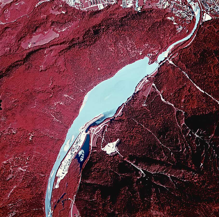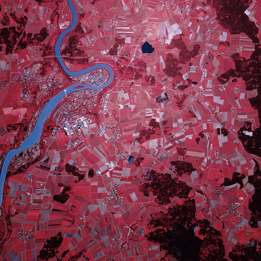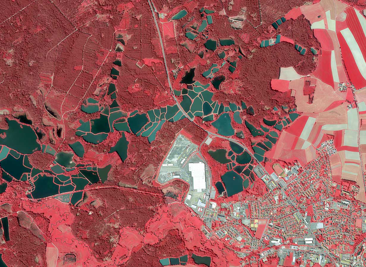 Was verbirgt sich eigentlich hinter den Luftbildern in Rottönen? Die sogenannten Color-Infrarot (CIR) Luftbilder setzen sich aus dem Wellenbereich des nahen Infrarots sowie den Farbkanälen Rot und Grün zusammen. Sie liefern detaillierte Informationen über den Zustand der Vegetation. Da der Pflanzenfarbstoff Chlorophyll das nahe Infrarot besonders stark reflektiert, gilt: Je roter die Vegetation im Luftbild erscheint, desto vitaler ist sie.
