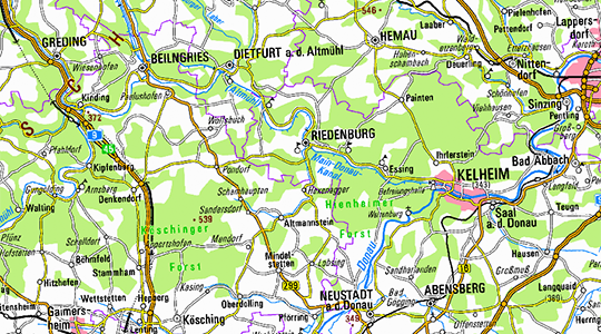 Auch im Maßstab 1:500 000 sind die wesentlichen Strukturen der Siedlungen, das Hauptverkehrsnetz, das Gewässernetz und die großen Wälder vollständig enthalten.