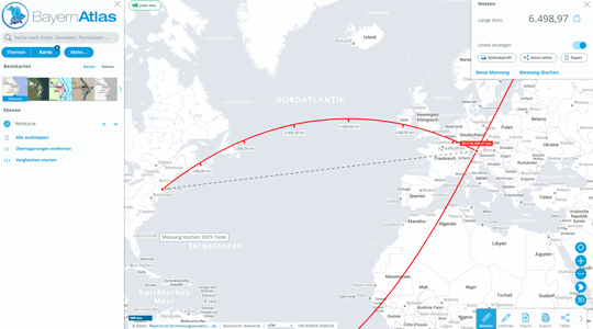Eine Besonderheit beim Messen im BayernAtlas ist die sogenannte Geodätische Linie, die ab einer Entfernung von 55,55 km angezeigt wird. Diese beschreibt die kürzeste Verbindung zwischen zwei Punkten auf einer gekrümmten Oberfläche, in diesem Fall der Erdoberfläche. Im Gegensatz zur geraden Linie auf einer zweidimensionalen Karte berücksichtigt die geodätische Linie die tatsächliche Form der Erde als Kugel bzw. Rotationsellipsoid.