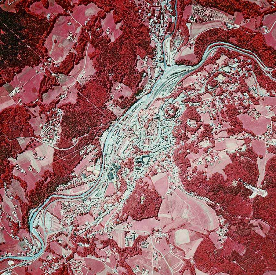 Color-Infrarot-Luftbild mit Bäumen in Rottönen, Gebäuden in blaugrau und Gewässer in hellblau